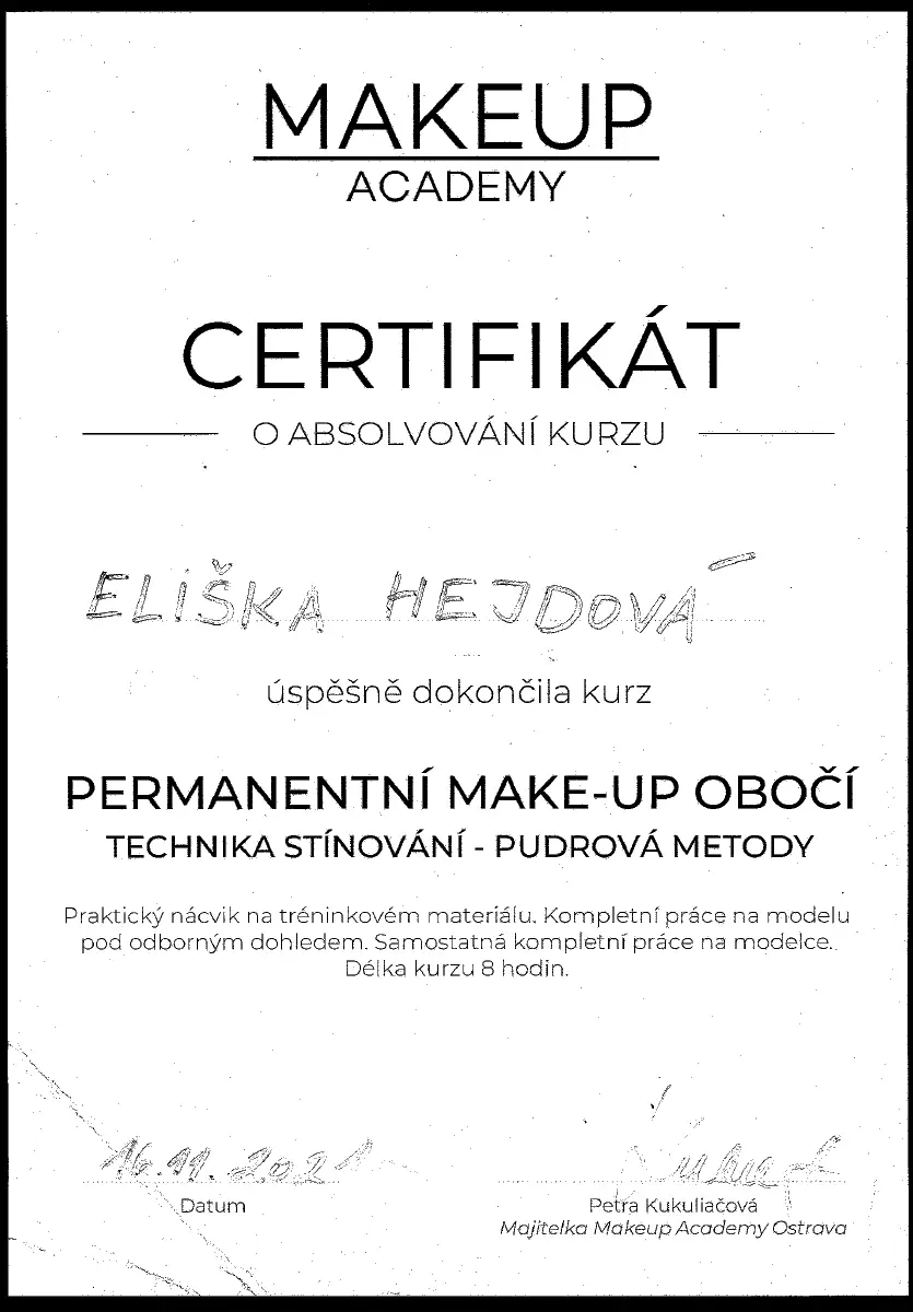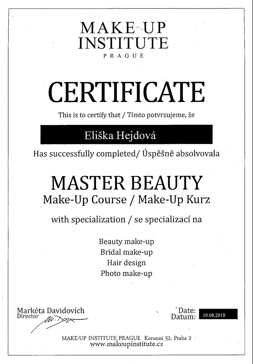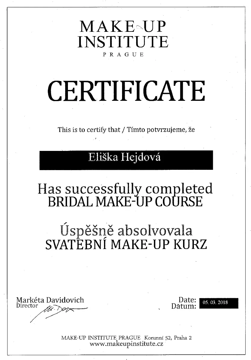 Absolvovala jsem kurzy střihů, makeupu a zvlášť jsem se specializovala na kurzy Svatebního líčení a Svatebních účesů. Kromě jiného jsem také absolventka kurzu Tvůrkyně proměn u Martiny Odstrčilové, která patří mezi naši špičku v beauty oblasti.